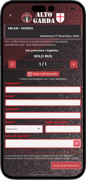 La prenotazione dei biglietti (fig. 5) richiede la compilazione di tutti i campi dei partecipanti.